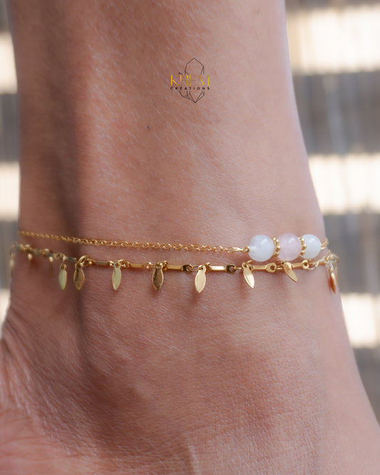 Chevillère Double – Pierre de Lune & Quartz Rose (19 cm + 5 cm)