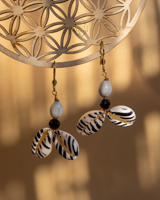 Boucles d'Oreilles Khaura – Cauris Tigrés Noirs et Pierres au Choix